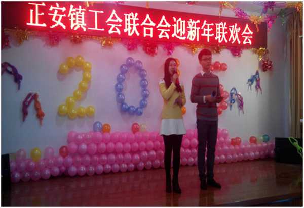 联欢会在两位大学生村官的主持下拉开序幕。镇党委副书记、工会主席张晓北发表了热情洋溢的新年致辞,机关干部赵国亮演唱的一曲《红旗飘飘》将联欢会高调开启,人大主席陈军的《爱拼才会赢》唱出了人生豪迈,诗朗诵《再别康桥》、吉他弹唱《画》展示了机关干部的多才多艺和浓厚的文化气息,舞蹈《火了火了火》跳出了正安人民红红火火的生活。节目中穿插游戏,比手画脚猜词语、气球爆破大比拼、齐心协力不NG,逗得大家开怀大笑。整台联欢会14个节目都是职工自编自演,联欢会在全体干部职工大合唱《歌唱祖国》中落下帷幕。