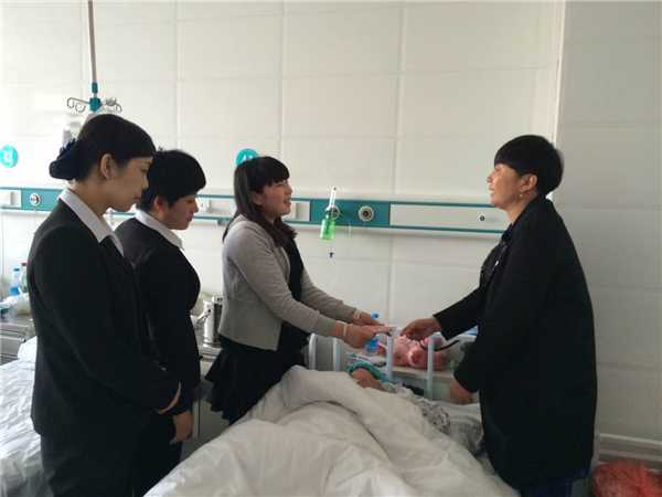 近日,金海岸百姓家宴员工崔秋兰的母亲身患重病住院。得知消息后,公司董事长王丽英、工会主席金波等一行人前往医院看望,送上工会的温暖问侯和企业的亲切的关怀,并祝老人早日康复。
