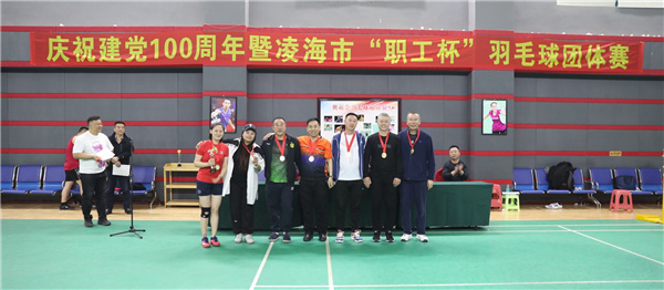 4月29日,庆祝建党100周年暨凌海市“职工杯”羽毛球团体赛在九华山温泉羽毛球馆圆满落幕。凌海億彩主席赵纪文、億彩常务副主席刘峰,市群众文体活动中心主任张进,市羽毛球协会会长张金丰等现场为获奖球队颁奖。