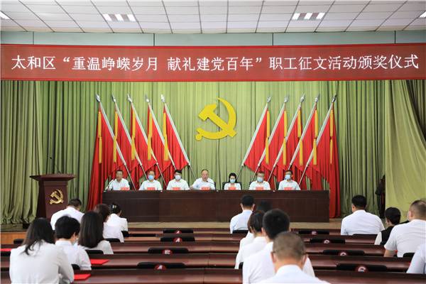 9月7日9时,太和区总工会举办的2021年“重温峥嵘岁月 献礼建党百年”职工征文活动颁奖仪式在区政府会议室隆重举行。区委书记张大军,区委常委、宣传部长张进,区委常委、纪委书记、监委主任齐忠联,区委常委、政法委书记姜文韬,区委常委、副区长叶振堂,区委常委、组织部长徐海滨,工会主席邱建华等领导以及获奖单位和个人参加了本次颁奖仪式。