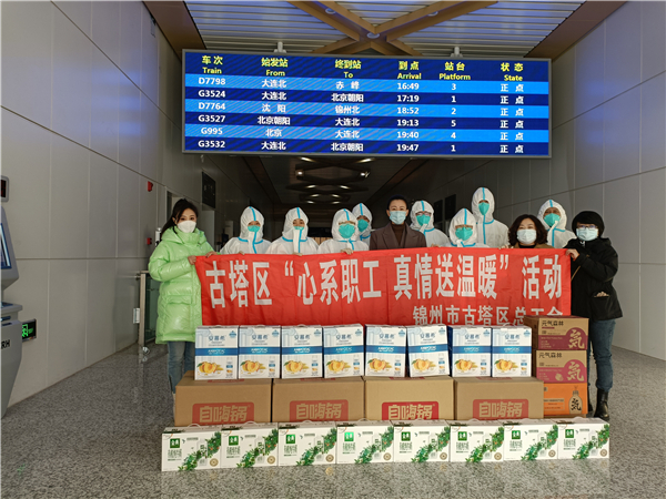 2月18日,古塔区总工会分管日常工作副主席韩娟带队,来到锦州北站,看望坚守在疫情防控一线的工作人员,为他们送去急需的生活保障物资,全力支持大家打好打赢疫情防控阻击战。