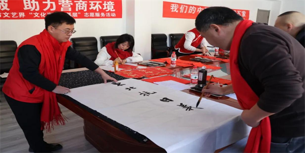 活动现场欢声笑语,热闹非凡。红纸为底,黑墨为字,在不同的书法家手中,春联和“福”字风格多样、笔势秀丽,他们挥毫泼墨,写对联写“福”字,笔力雄健,气韵生动,将新春佳节的气氛挥洒得淋漓尽致。无联不成春,有联春更浓,手写春联既是心意,也是新年里独有的一份“热闹”。一行行俊秀苍劲的书法,一句句墨香四溢的语句,饱含着幸福吉祥,寄托着希望美好。