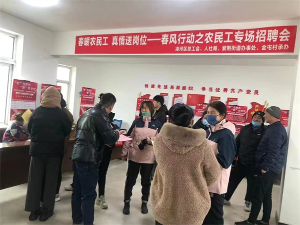 近日,由凌河区总工会、凌河区人社局、紫荆街道主办,凌河区人社中心、紫荆街道街道金屯村承办的“春暖农民工,真情送岗位”专场招聘会在紫荆街道金屯村举办,主要面向农民工群体开展求职招聘活动。