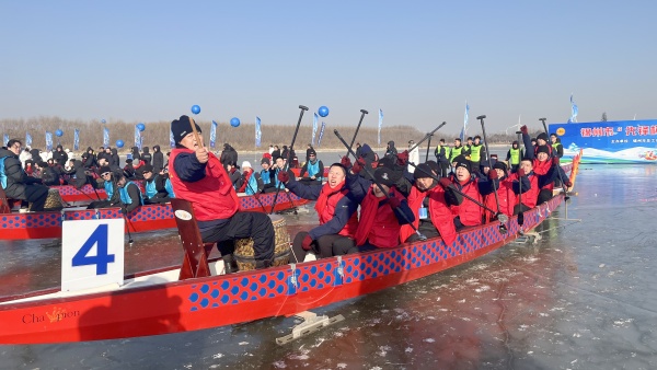 伴随着裁判的发令,经开区龙舟队犹如离弦之箭,在激昂的鼓点中奋力挥动冰钎,全体队员动作整齐划一,伴随着激昂的口号声,驾驶着龙舟全力冲向终点,生动展示了“定了就干、干就干成”的经开区速度。