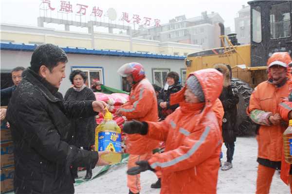 “雪中送温暖,真情暖人心”,2017年1月19日,冒着大雪天,在工委副书记、管委会主任梁秋的带领下,松山新区总工会全体工作人员带着价值3.8万余元的礼品为仍坚守在一线工作的区环卫工人送去温暖。
