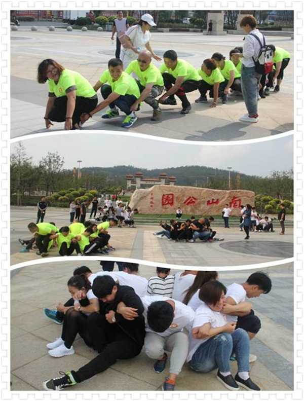 比赛后,在南山公园广场前组织了团队拓展活动。 坐地起身—10名队员围坐成一圈,背对背的坐在地上,不用手撑地站起来,用时最短获胜。奋力蹲行—10名队员蹲在地上后一名队员握住前一名队员的脚踝共同前进抵达终点。4队体现出了团队合作的强大优势,有充当指挥官分配任务的,有自当智囊团分析游戏规则的,有甘当护卫队保障队员取得好成绩的,体现了阳光人的超强的凝聚力和良好的精神风貌。