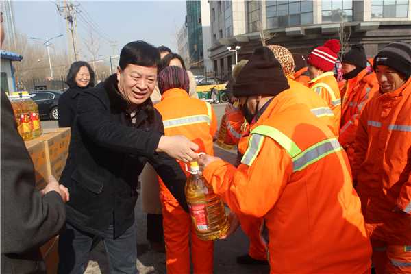 “春节慰问送温暖,工会关怀暖人心”,2月8日小年当天,在松山新区工会主席张强的带领下,松山新区总工会全体工作人员带着价值5.5万余元的花生油为节假日仍坚守在一线工作的区环卫工人送去温暖。