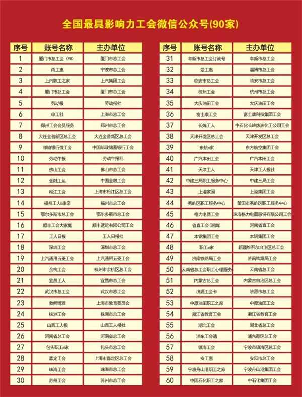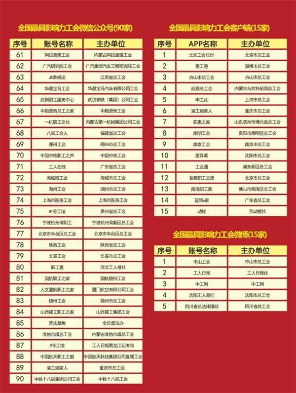 自2015年12月中华全国总工会举办首届全国最有影响力工会新媒体论坛以来,全国工会系统新媒体呈现蓬勃发展势头。一年内,工会新媒体数量从1300余个迅速增长至目前的9000余个;工会新媒体类型更加丰富多元,微信、微博、客户端及其他形态的新媒体相互交织;新媒体作用发挥更加积极主动、富有成效,初现从纯宣传转向为职工提供切实服务的新动向;工会新媒体的综合影响力得到巨大提升,一批工会新媒体已成为地方甚至全国的知名账号。经对工会系统各类新媒体进行为期一年的影响力监测和综合排名,最终选出全国最有影响力工会微信公众号90个、客户端(APP)15个、微博5个。