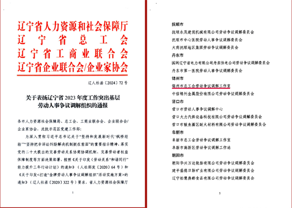 近日,辽宁省人力资源和社会保障厅、辽宁省总工会等四家单位联合印发《关于表扬辽宁省2023年度工作突出基层劳动人事争议调解组织的通报》,锦州億彩劳动争议调解工作室获评辽宁省2023年“金牌劳动人事争议调解组织”。