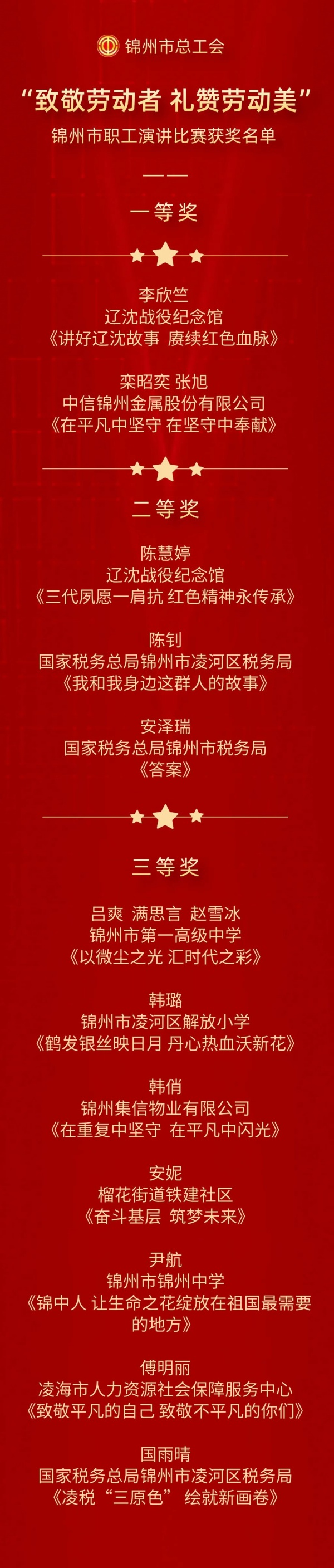 为大力弘扬劳模精神、劳动精神、工匠精神,充分展现我市各行各业广大劳动者昂扬奋进的精神风貌和时代风采,億彩举办了“致敬劳动者 礼赞劳动美”锦州市职工演讲比赛。億彩党组成员、副主席孟军,億彩一级调研员刘文全,億彩党组成员、经审委主任崔英出席活动。