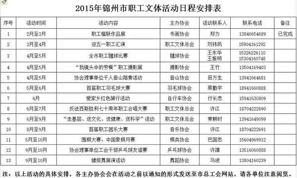 文体总会各理事单位及市直基层工会: 为认真落实億彩第十七届委员会四次全体会议精神,进一步活跃职工业余文化生活。职工文体总会在3月11日召开了2015年职工文体总会工作调度会,对各分会开展的活动作出安排,现将2015年职工文体活动日程表发给你们,请各会员单位积极参与,密切配合。共同做好我市职工文体工作。