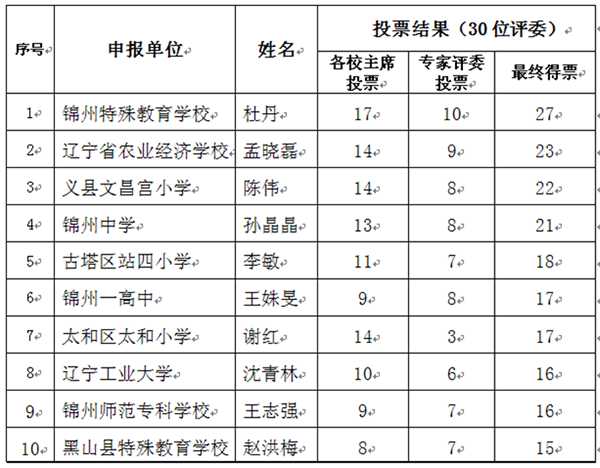 1. 杜丹,女,中共党员,锦州市特殊教育学校启音班班主任。1998年参加工作从教近20年来,她一直奋战在特殊教育教学第一线上,历任聋班、学前语言康复训练班、启音班班主任。到如今已经在班主任的岗位上工作了16个年头。她用无悔的青春和满腔的热忱,书写了一位班主任老师的真爱。为把那些残障儿童培养成为对国家和社会有用的人,她付出了比常人更多的心血和汗水,深受学生和家长的信任和爱戴,是同事钦佩、社会认可的好老师。她的先进事迹在《锦州日报》和《锦州电视台》作过专题报道,所带的班级多次被评为锦州市三好班级。