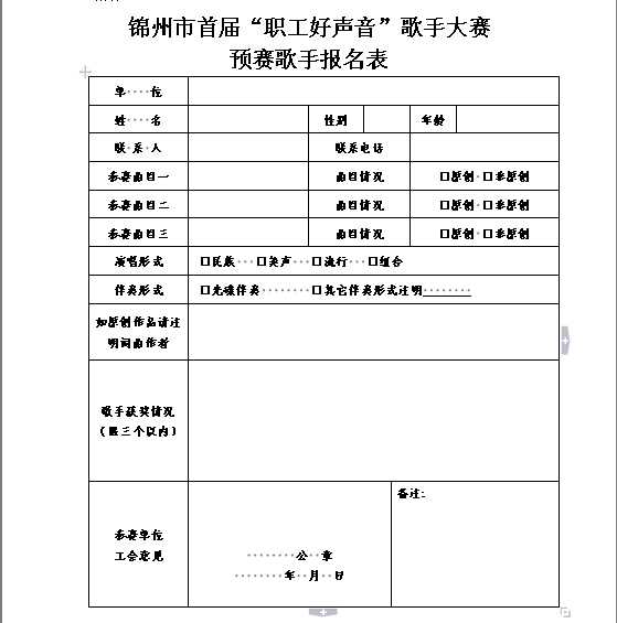 1.预赛由专业评委对各赛区的比赛统一进行现场评审。评审将采取现场打分不亮分和综合评议相结合的方法,最后产生参加复赛的选手,入围名单将在锦州工会网上公布。