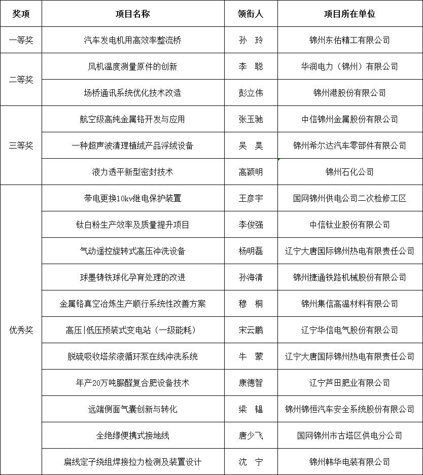 锦州市第九届“状元杯”职工职业技能大赛暨全市职工创新成果转化大赛获奖项目名单