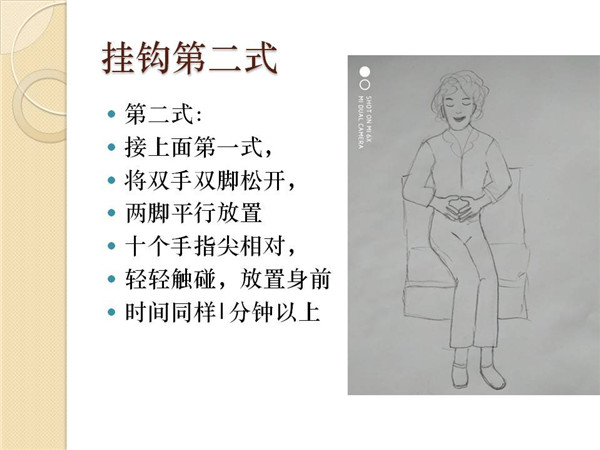 挂钩这个动作,时间可以自行延长,可以把他当成一个冥想来练习,可以到达30分钟甚至更长时间。这个动作,可以使我们的情绪走向踏实,不至于翻涌、散乱,连接人体电流,把注意力和散乱的能量集中起来,从而将能量的循环通道打通,将紧张阻塞的地方疏通,大脑和身体放松。