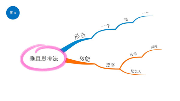 垂直思考法,它的形态是一个接一个,功能是提高记忆力和思考的深度。有人可能会问,这和思考的深度有什么有关系,我们再举一个例子,