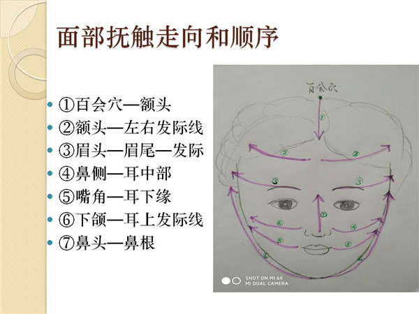 进行抚触时,一般来讲秉持这样一个顺序:由前到后,由上向下,就是先从头开始向下抚触,先是身体前面再身体后面。脸部是由下向上。抚触过程中要有语言交流,适当询问他的感觉,以便您调整手部力量的轻重,以对方感觉舒适为准。语音要温和轻柔,营造温馨安全的氛围。