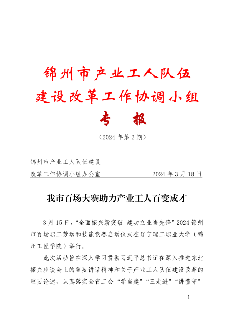 锦州市产业工人队伍建设改革工作协调小组专报(2024第1期)