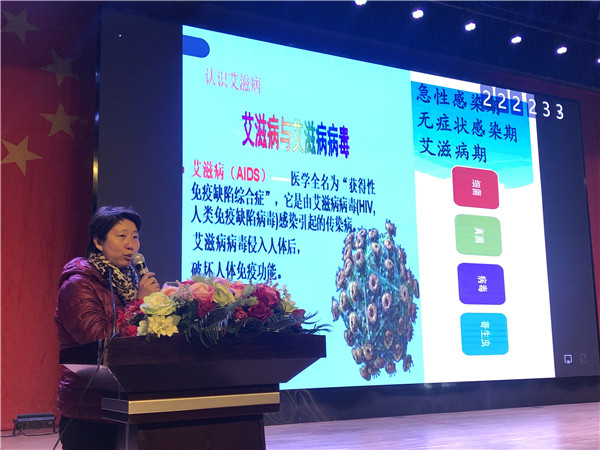 随后,市传染病医院关爱科关海英主任为学校师生进行了艾滋病知识讲座。关海英主任讲解了艾滋病的流行现状、传播途径、怎样预防、怎样对待艾滋病感染者、艾滋病对青年学生的危害等相关知识,深入浅出地为师生普及了艾滋病防治知识,并针对刚才讲解的内容进行了有奖问答提问,学生们踊跃发言,现场气氛十分活跃。关主任通过诙谐幽默的讲解,将防病知识寓教于乐,使同学们更深刻的理解了艾滋病的传播途径和防治手段。并与学生进行互动问答,加深他们对艾滋病防治基本知识和艾滋病防治重要性的认识。